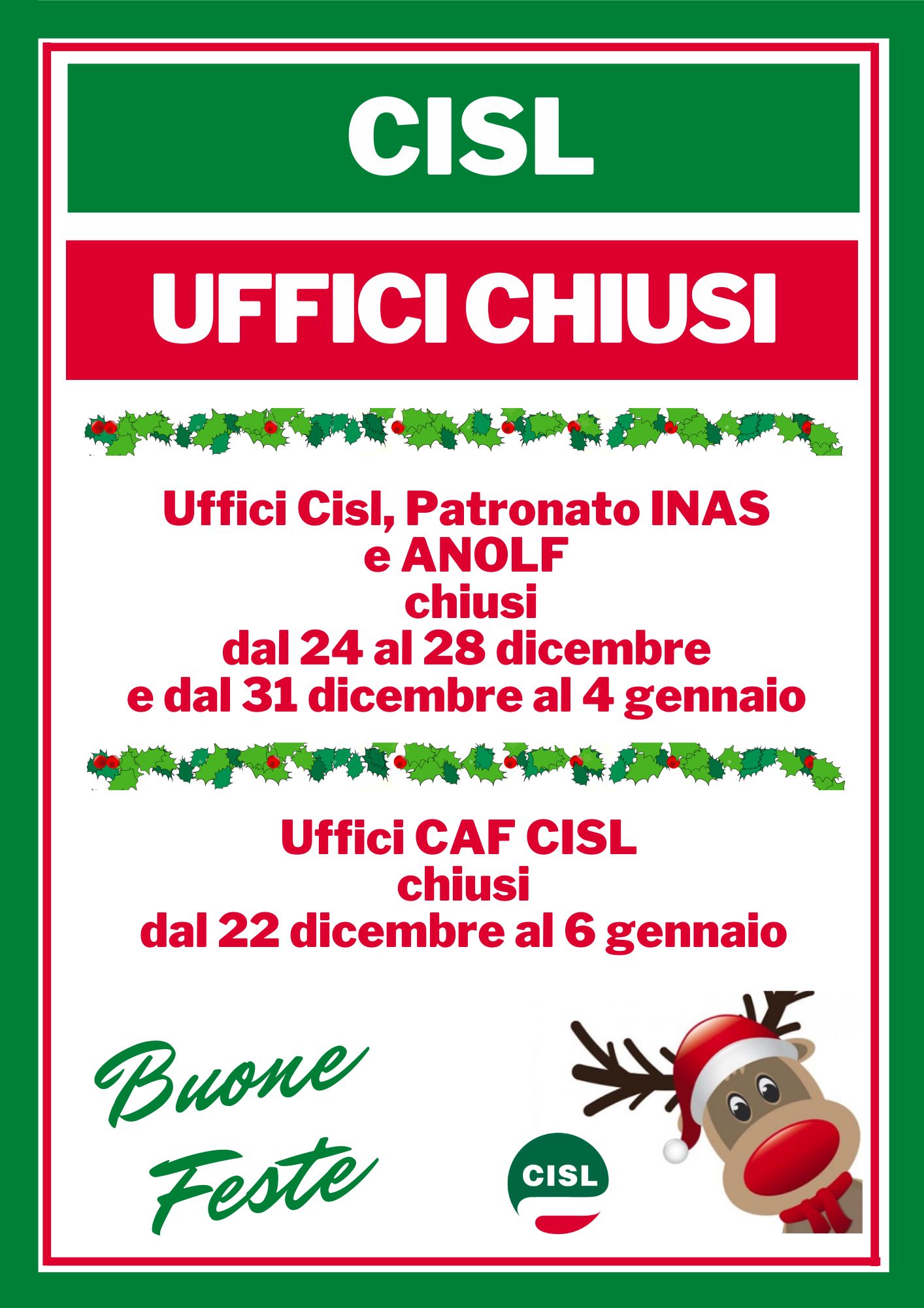 Gli Uffici Cisl, Patronato INAS e ANOLF saranno chiusi dal 24 al 28 dicembre 2025 e dal 31 dicembre 2025 al 4 gennaio 2026 Gli Uffici CAF Cisl E COLF BADANTI saranno chiusi dal 22 dicembre 2025 al 6 gennaio 2026 AUGURIAMO A TUTTI DELLE BUONE FESTE!