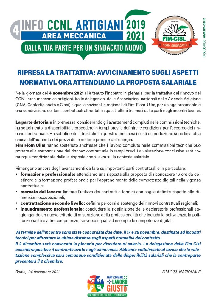 Nella giornata del 4 novembre 2021 si è tenuto l’incontro in plenaria, per la trattativa del rinnovo del CCNL area meccanica artigiani, tra le delegazioni delle Associazioni nazionali delle Aziende Artigiane (CNA, Confartigianato e Claai) e quelle nazionali e regionali di Fim-Fiom-Uilm, per un aggiornamento e una condivisione dei temi contrattuali affrontati in questi ultimi tre mesi dalle parti negli incontri tecnici.