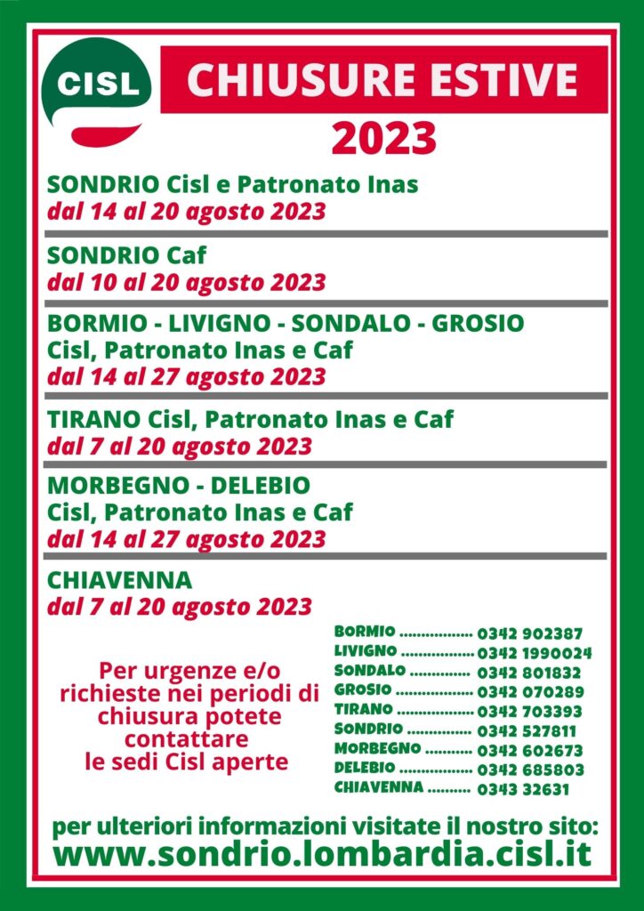 Senza categoria CHIUSURE ESTIVE 2023 di Marika Cornaggia|Pubblicato 19 Luglio 2023 SONDRIO CISL E PATRONATODAL 14 AL 20 AGOSTO 2023 SONDRIO CAFDAL 10 AL 20 AGOSTO 2023 LIVIGNO- BORMIO – SONDALO E GROSIOCISL, PATRONATO E CAFDAL 14 AL 27 AGOSTO 2023 TIRANOCISL, PATRONATO E CAFDAL 7 AL 20 AGOSTO 2023 MORBEGNO E DELEBIOCISL, PATRONATO E CAFDAL 14 AL 27 AGOSTO 2023 CHIAVENNACISL, PATRONATO E CAFDAL 7 AL 20 AGOSTO 2023