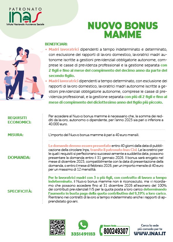 Il Patronato INAS CISL è a disposizione per guidarti passo dopo passo nella richiesta del Bonus Mamme 2025.