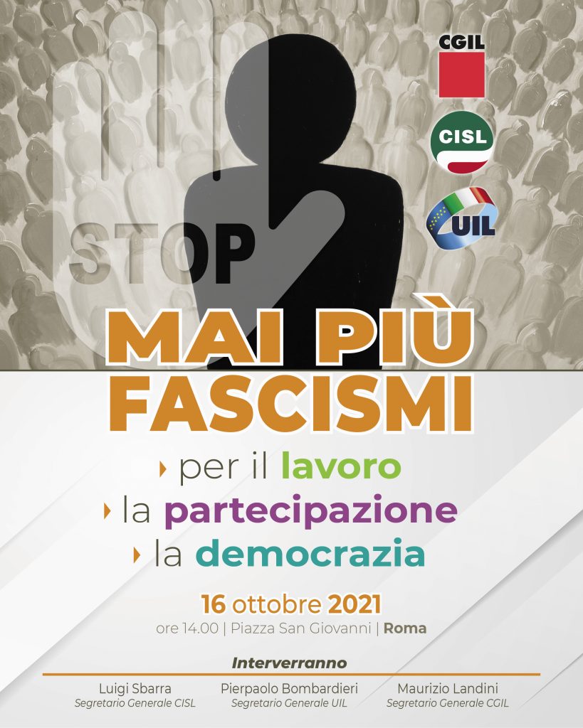 ‘Mai più fascismi, per il lavoro, la partecipazione, la democrazia’ lo slogan della Manifestazione Nazionale indetta da Cgil Cisl Uil per sabato 16 ottobre che si terrà in Piazza San Giovanni a Roma a partire dalle ore 14.00. “Una manifestazione che assume un significato di grande valenza sociale” sottolinea il Segretario generale della Cisl, Luigi Sbarra invitando alla “mobilitazione ed alla partecipazione” non solo gli iscritti al sindacato “ma anche tutti i cittadini e le tante forze sane e democratiche del nostro paese”.
