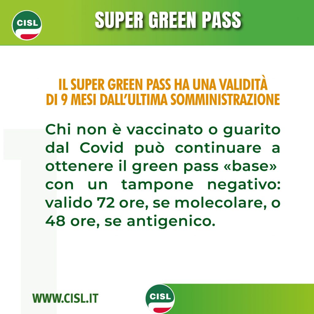 IL SUPER GREEN PASS HA VALIDITA’ 9 MESI DALL’ULTIMA SOMMINISTRAZIONE.
