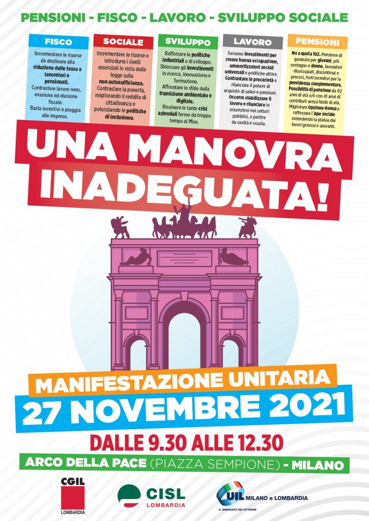 “Una manovra inadeguata!” è lo slogan della manifestazione regionale unitaria organizzata da Cgil, Cisl e Uil Lombardia nell’ambito della mobilitazione nazionale a sostegno delle proposte e le piattaforme presentate al governo in questi mesi e nell’incontro del 26 ottobre alla Presidenza del Consiglio (investimenti, lavoro pubblico e privato , creazione di nuova occupazione , protezioni sociali, fisco , pensioni, etc ), per modificare il tal senso la misure previste in legge di stabilità.