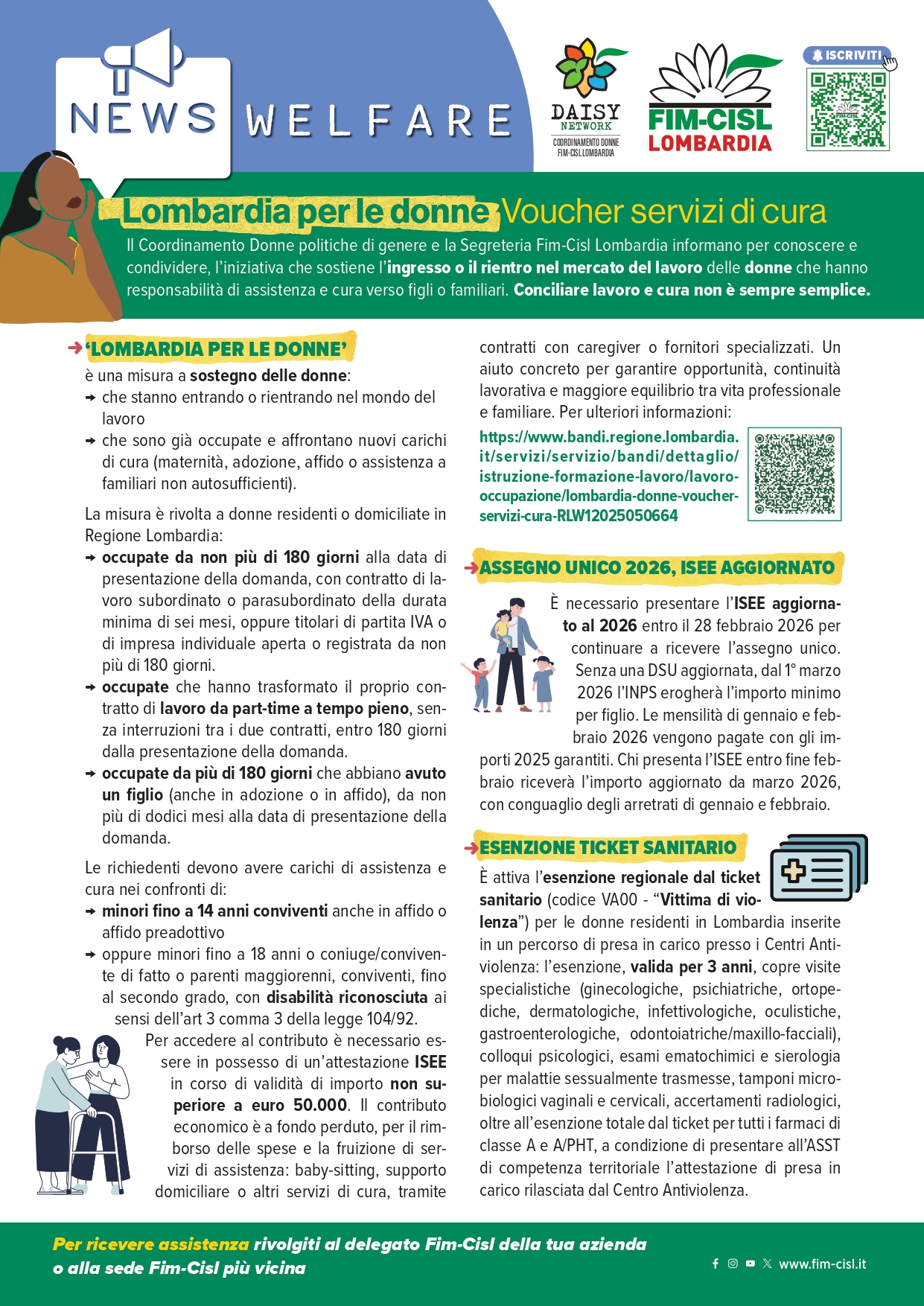 Il Coordinamento Donne Politiche di Genere e la Segreteria Fim-Cisl Lombardia promuovono e condividono alcune importanti opportunità di welfare rivolte alle donne, con l’obiettivo di sostenere concretamente chi affronta il difficile equilibrio tra lavoro e responsabilità di cura.
